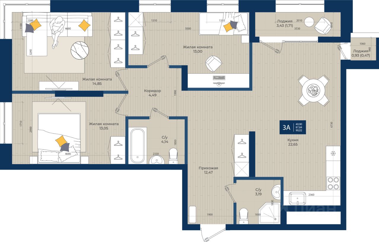 Жилой комплекс "NOVA 2", Квартира 22 общей площадью 90,02 м2 на 4 этаже.