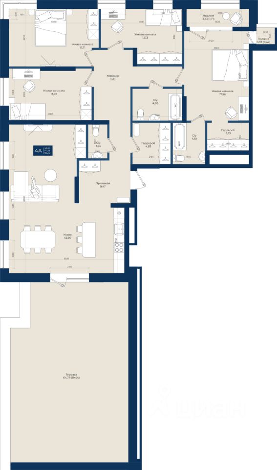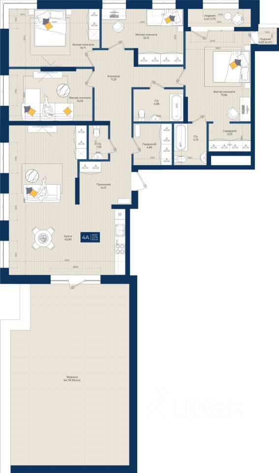 В проекте представлены квартиры с террасами, с которых открываются панорамные виды на центр города и другие эксклюзивные форматы: квартиры с патио, квартиры с увеличенными потолками до 4,8 м., пентхаусы с отдельным доступом в лифт на верхних этажах жилых башен. Во всех квартирах выполнена черновая отделка.