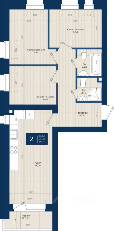 "ЖК на Чехова", Дом 2, Квартира 2 общей площадью 60,71 м2 на 1 этаже.