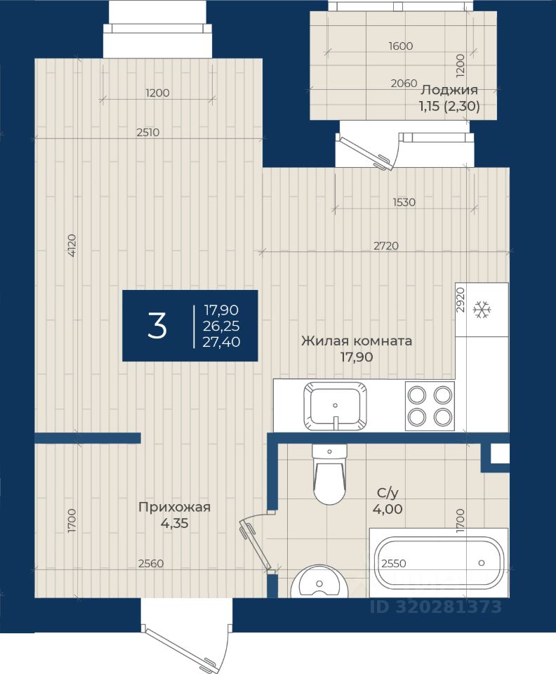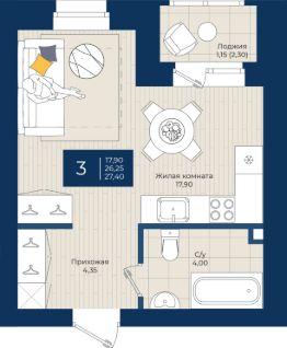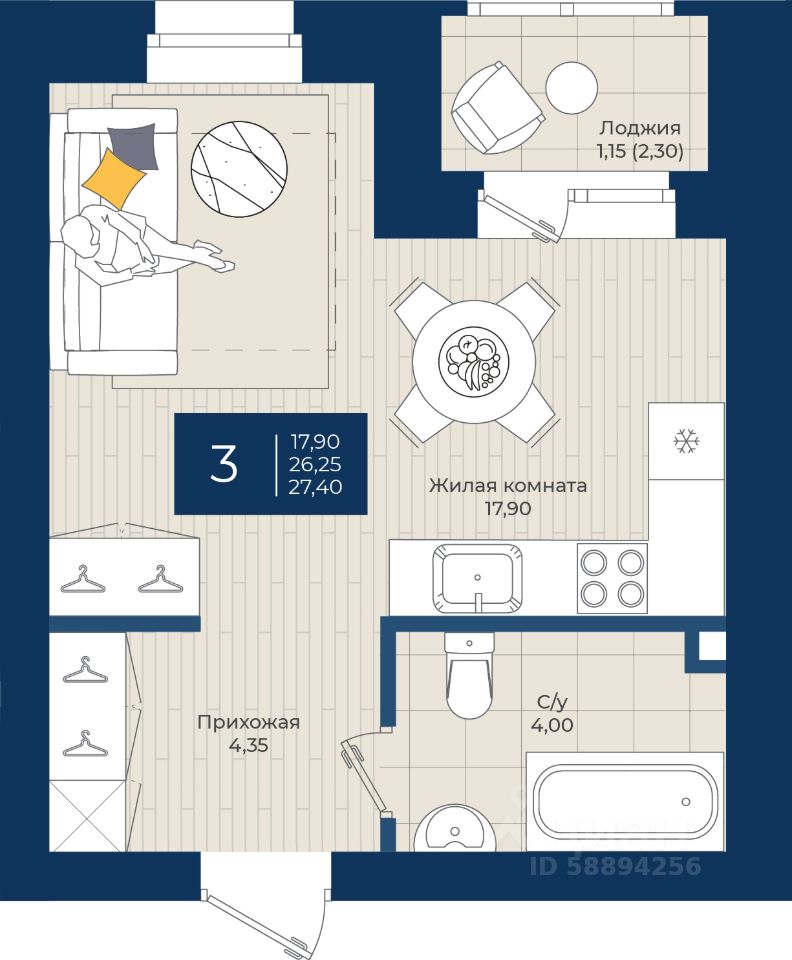 "ЖК на Чехова", Дом 2, Квартира 3 общей площадью 27,4 м2 на 1 этаже.