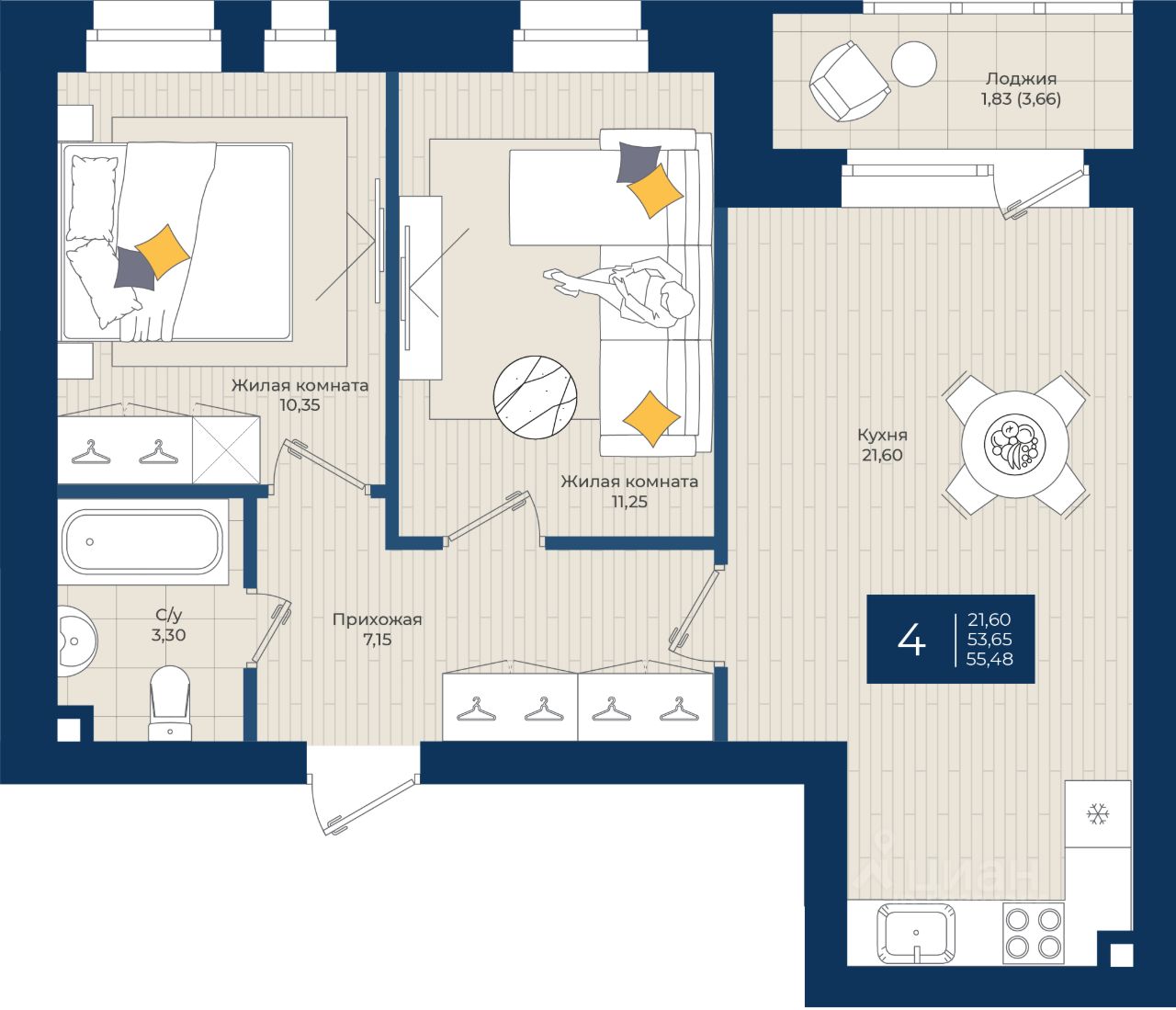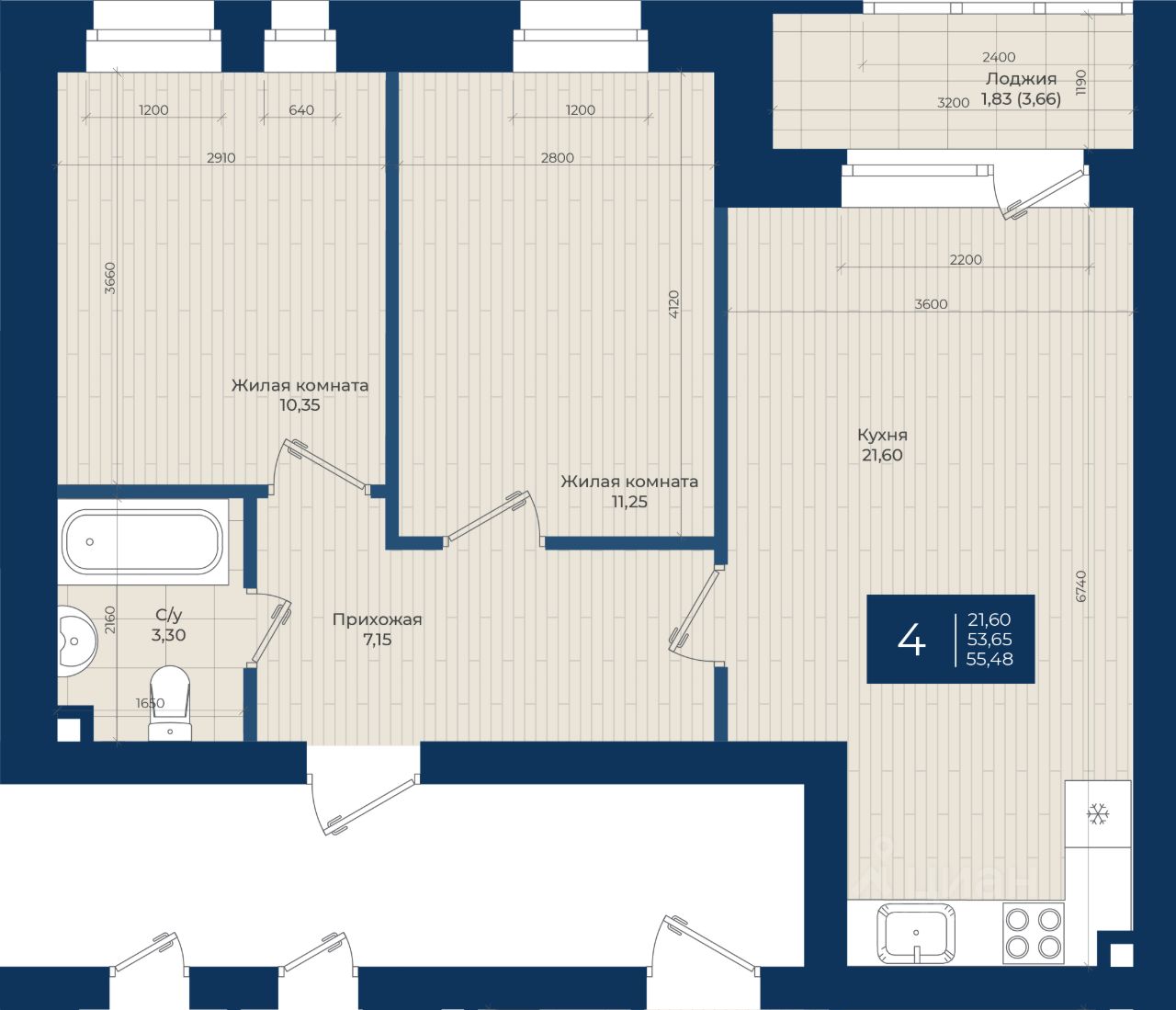 "ЖК на Чехова", Дом 2, Квартира 4 общей площадью 55,48 м2 на 1 этаже.