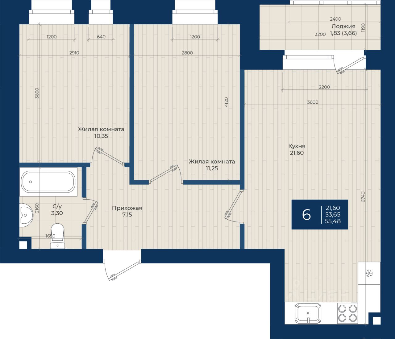 "ЖК на Чехова", Дом 2, Квартира 6 общей площадью 55,48 м2 на 2 этаже.