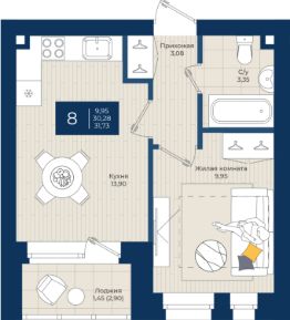 "ЖК на Чехова", Дом 2, Квартира 8 общей площадью 31,73 м2 на 2 этаже.