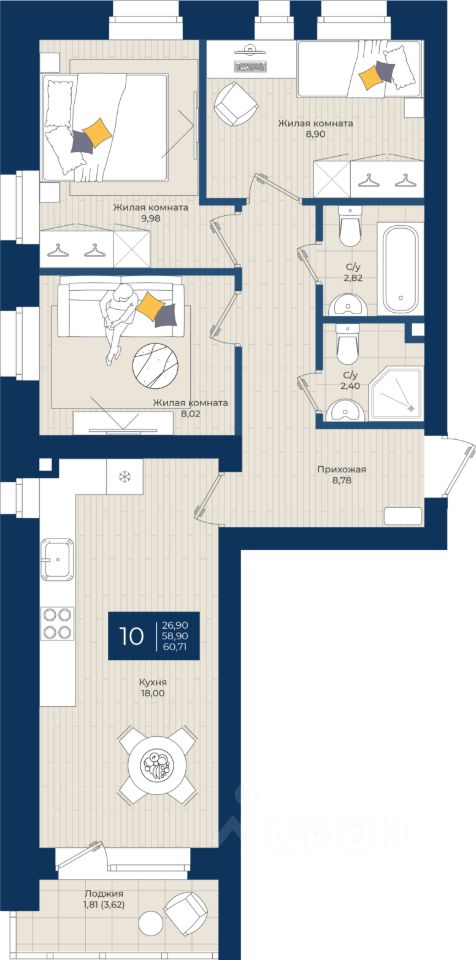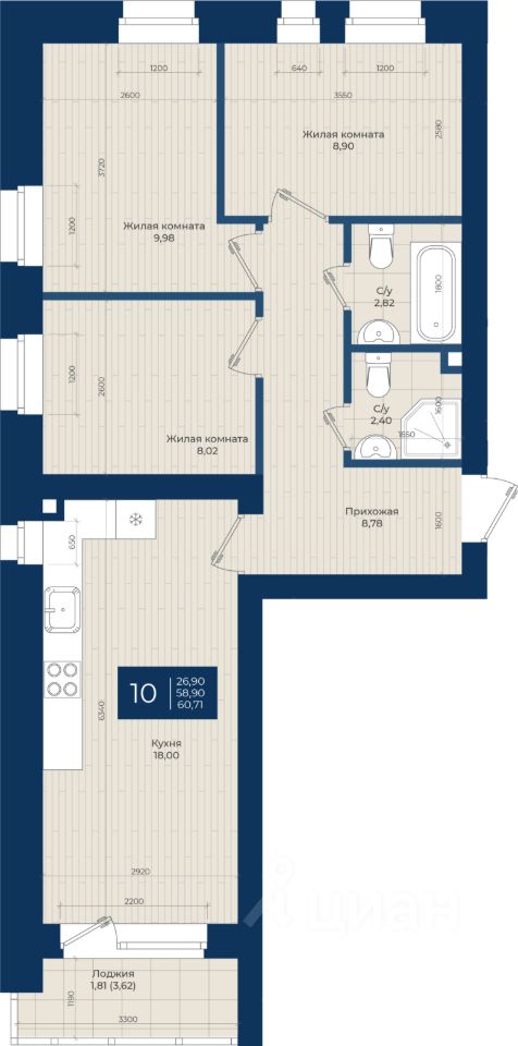 "ЖК на Чехова", Дом 2, Квартира 10 общей площадью 60,71 м2 на 2 этаже.