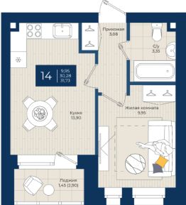 "ЖК на Чехова", Дом 2, Квартира 14 общей площадью 31,73 м2 на 3 этаже.