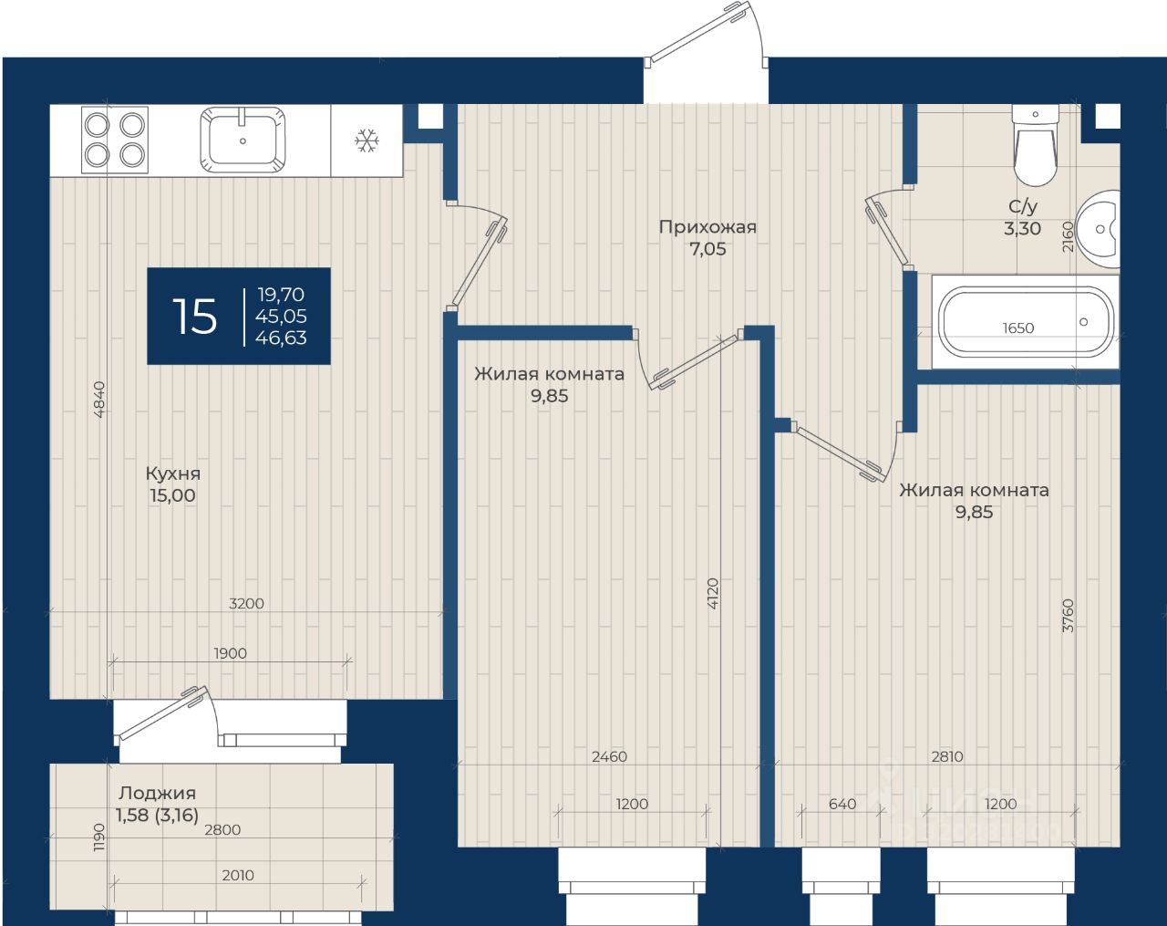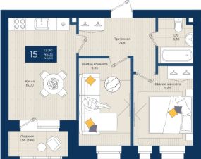 "ЖК на Чехова", Дом 2, Квартира 15 общей площадью 46,63 м2 на 3 этаже.