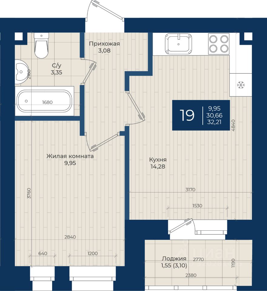"ЖК на Чехова", Дом 2, Квартира 19 общей площадью 32,21 м2 на 4 этаже.