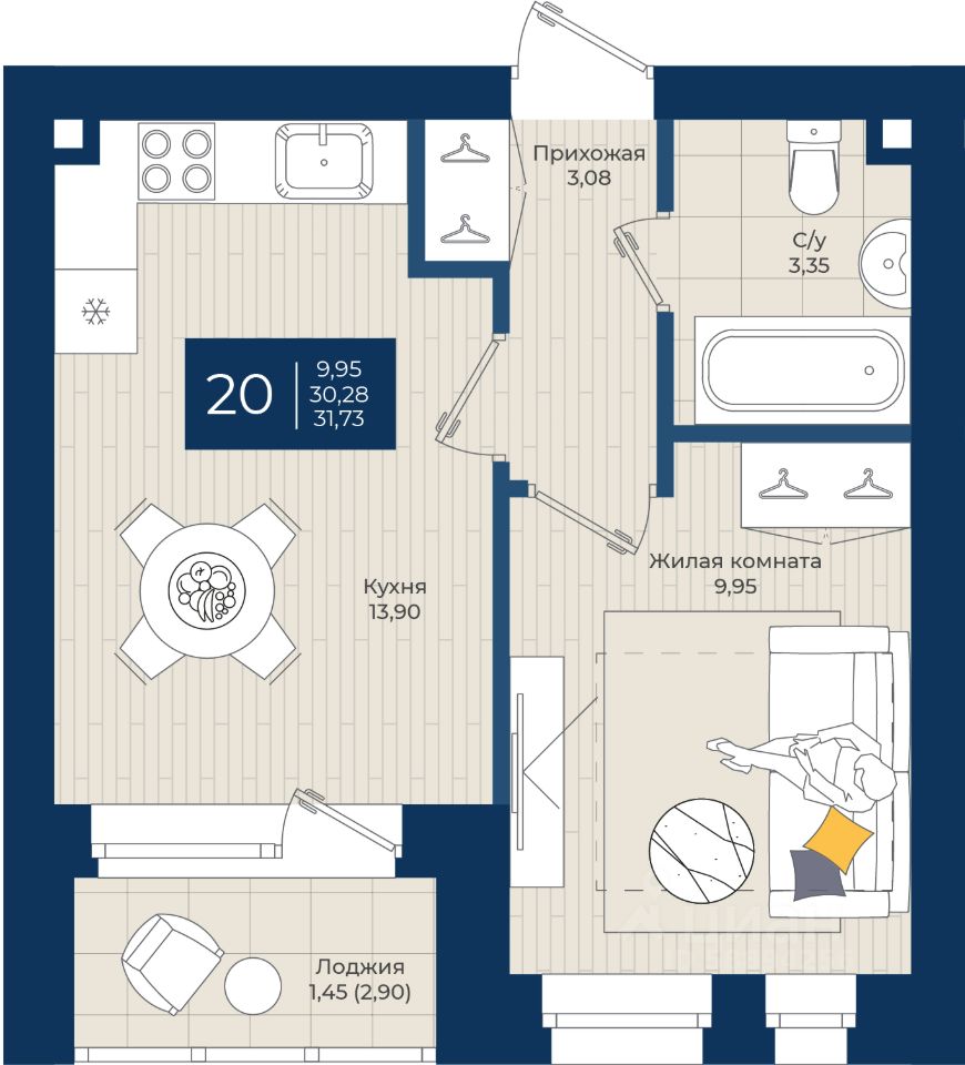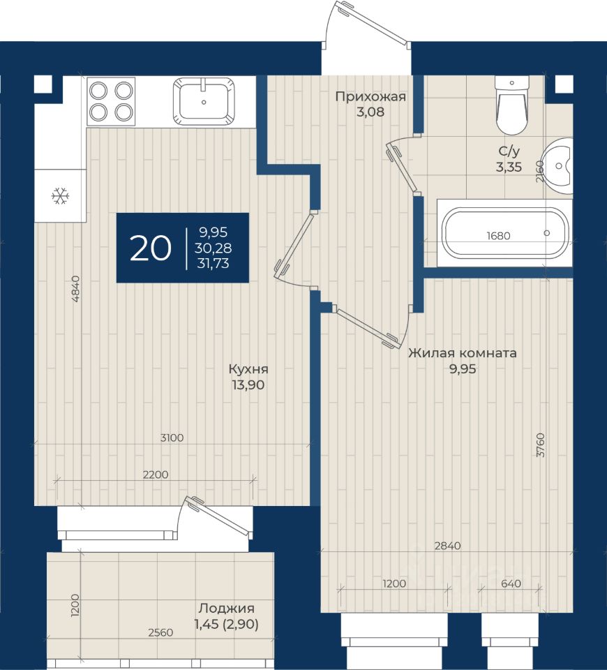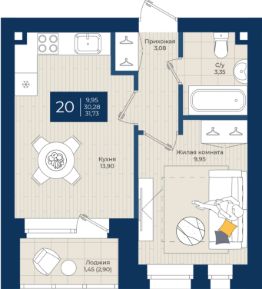 "ЖК на Чехова", Дом 2, Квартира 20 общей площадью 31,73 м2 на 4 этаже.