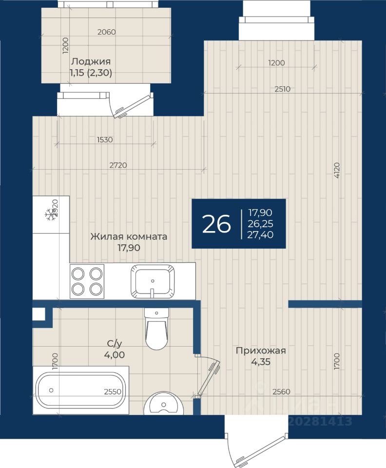 "ЖК на Чехова", Дом 2, Квартира 26 общей площадью 27,4 м2 на 1 этаже.