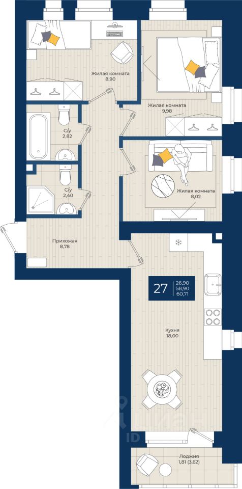 "ЖК на Чехова", Дом 2, Квартира 27 общей площадью 60,71 м2 на 1 этаже.