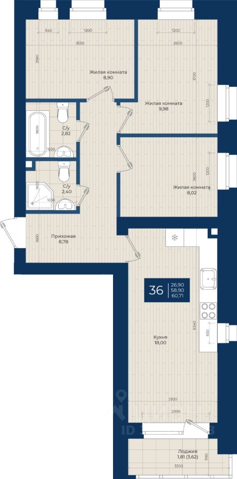 "ЖК на Чехова", Дом 2, Квартира 36 общей площадью 60,71 м2 на 3 этаже.