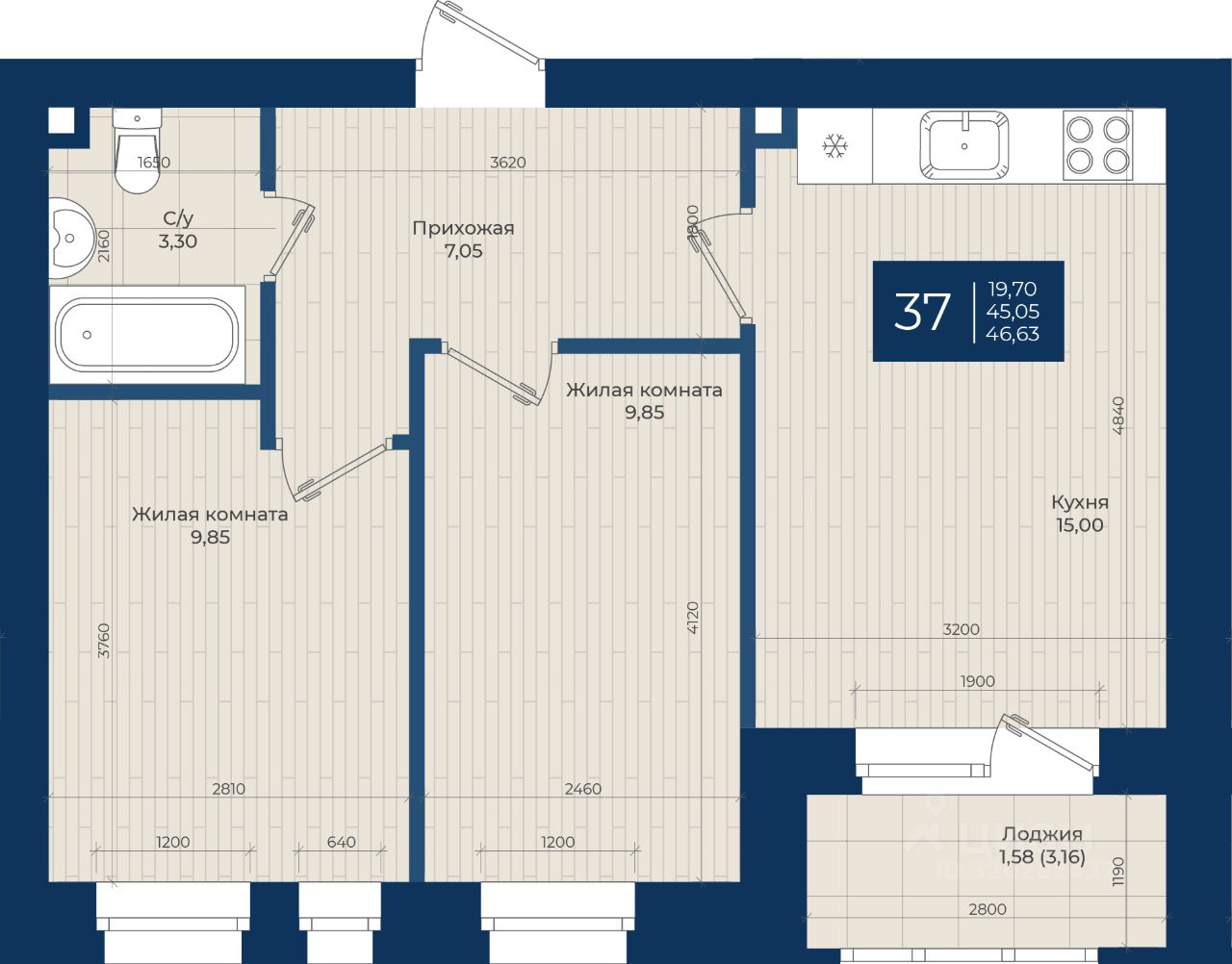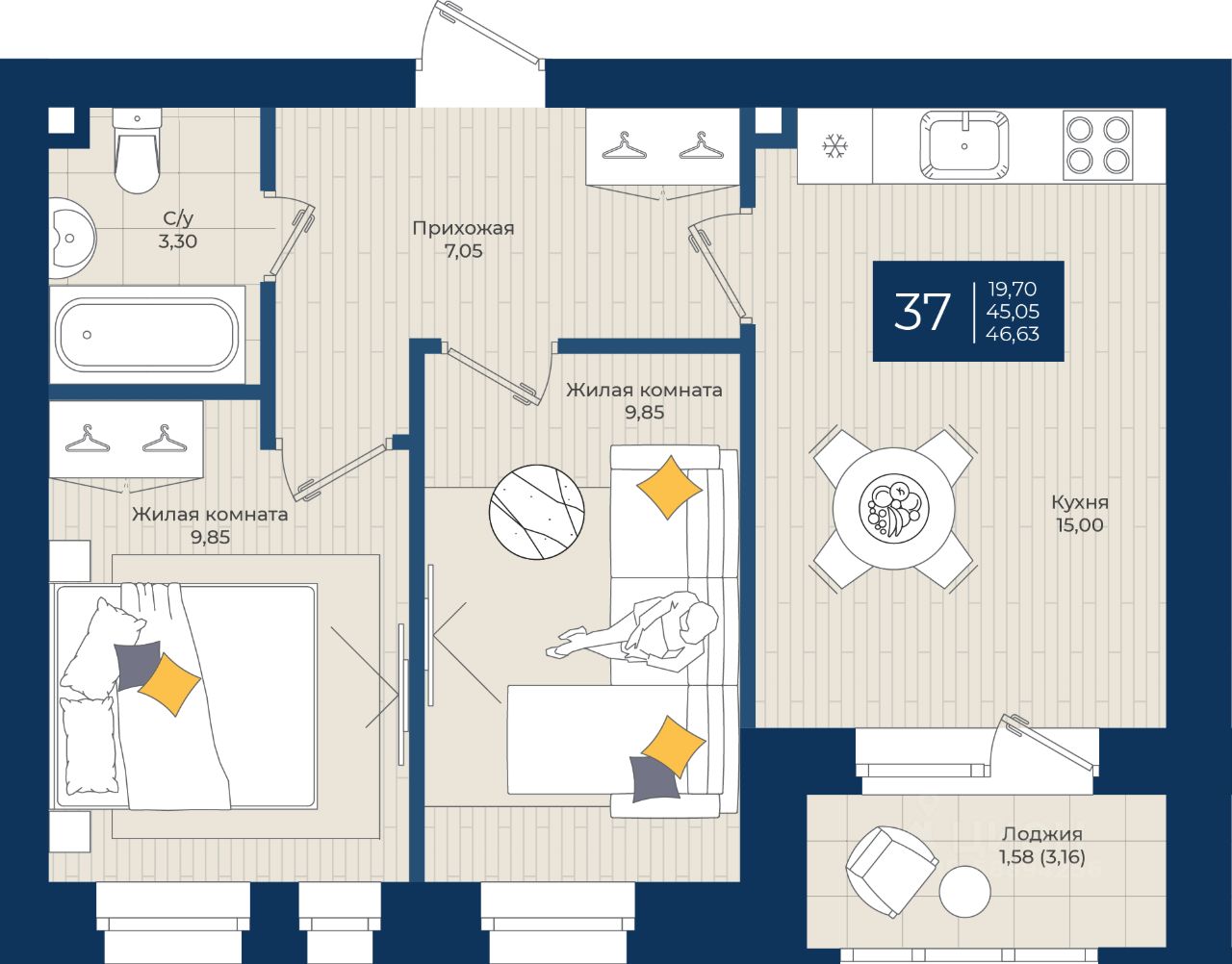 "ЖК на Чехова", Дом 2, Квартира 37 общей площадью 46,63 м2 на 3 этаже.