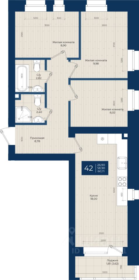 "ЖК на Чехова", Дом 2, Квартира 42 общей площадью 60,71 м2 на 4 этаже.