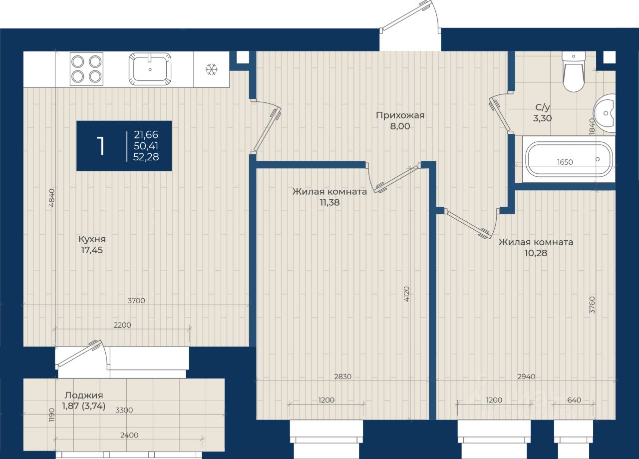 "ЖК на Чехова", Дом 1, Квартира 1 общей площадью 52,28 м2 на 1 этаже.