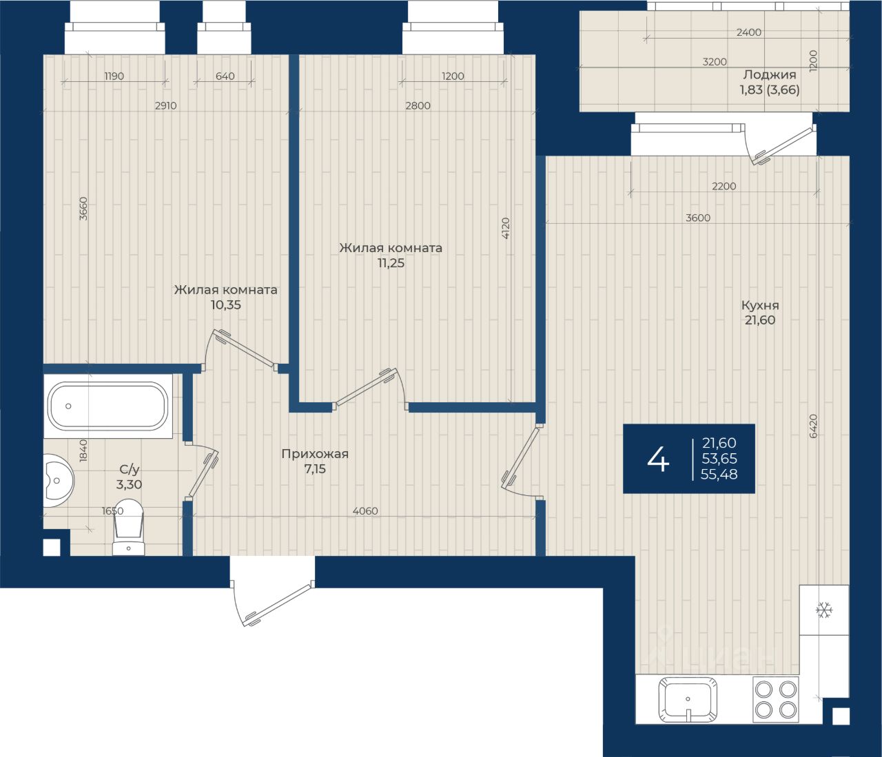 "ЖК на Чехова", Дом 1, Квартира 4 общей площадью 55,48 м2 на 1 этаже.