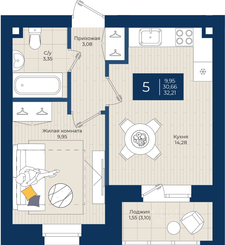 "ЖК на Чехова", Дом 1, Квартира 5 общей площадью 32,21 м2 на 1 этаже.