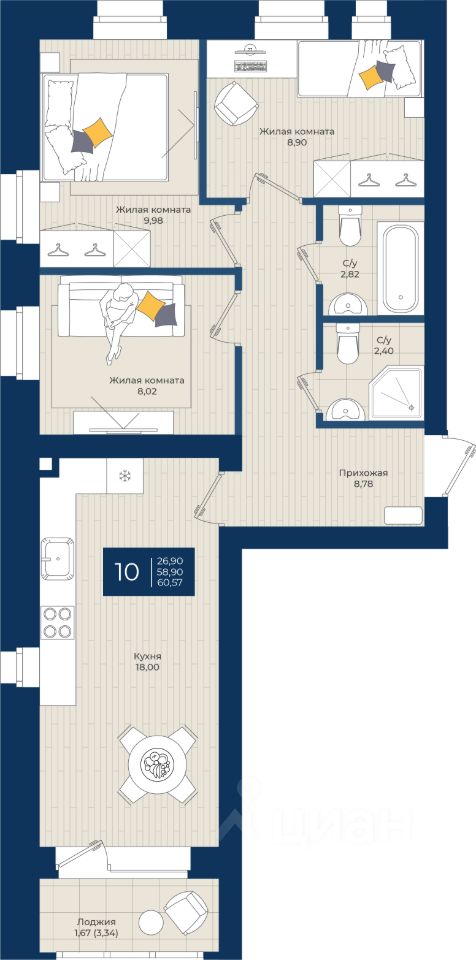 "ЖК на Чехова", Дом 1, Квартира 10 общей площадью 60,57 м2 на 2 этаже.
