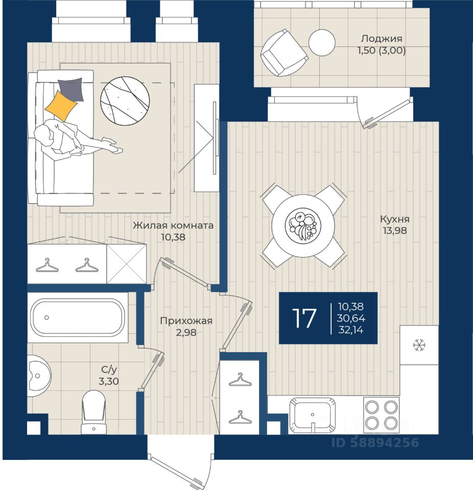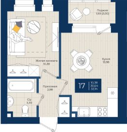 "ЖК на Чехова", Дом 1, Квартира 17 общей площадью 32,14 м2 на 3 этаже.