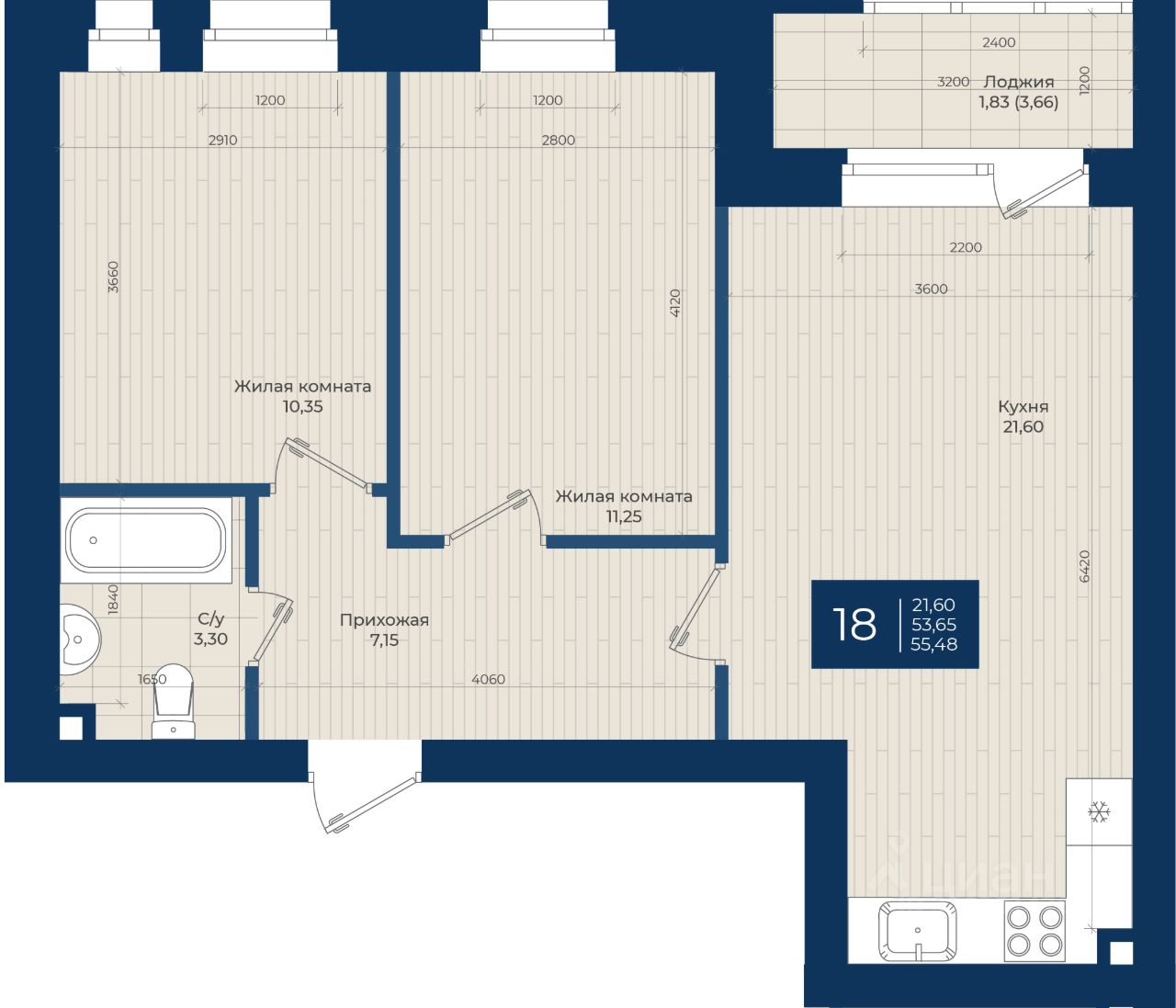 "ЖК на Чехова", Дом 1, Квартира 18 общей площадью 55,48 м2 на 4 этаже.