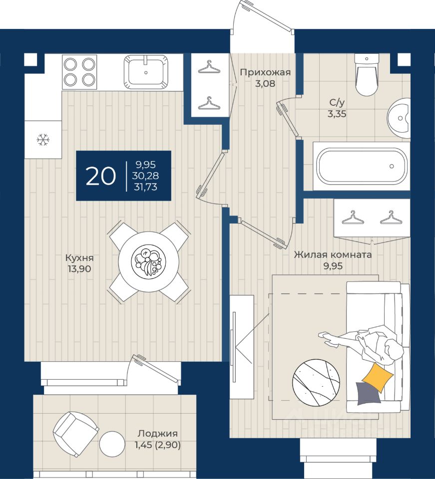 "ЖК на Чехова", Дом 1, Квартира 20 общей площадью 31,73 м2 на 4 этаже.