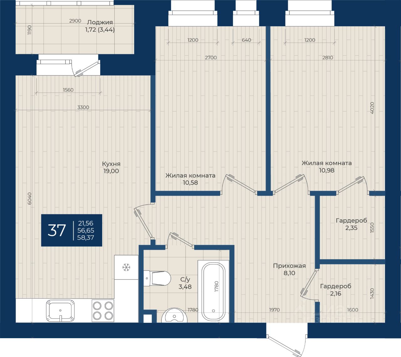 "ЖК на Чехова", Дом 1, Квартира 37 общей площадью 58,37 м2 на 3 этаже.