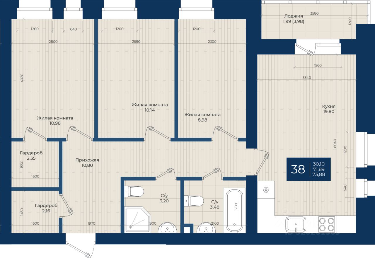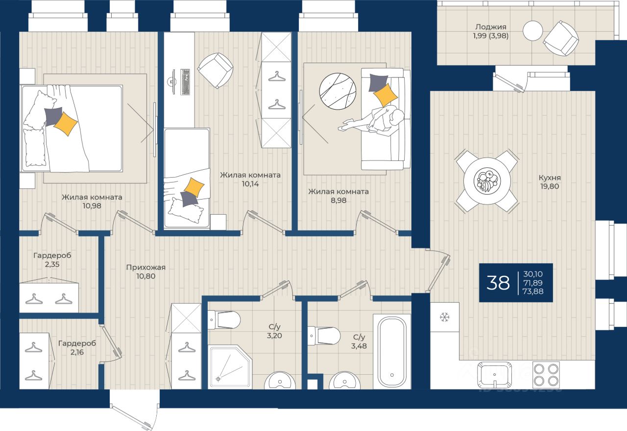 "ЖК на Чехова", Дом 1, Квартира 38 общей площадью 73,88 м2 на 3 этаже.