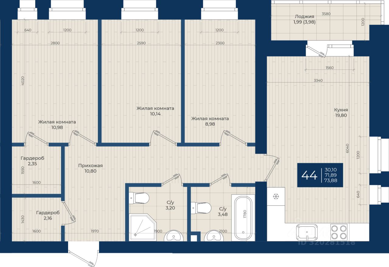 "ЖК на Чехова", Дом 1, Квартира 44 общей площадью 73,88 м2 на 4 этаже.