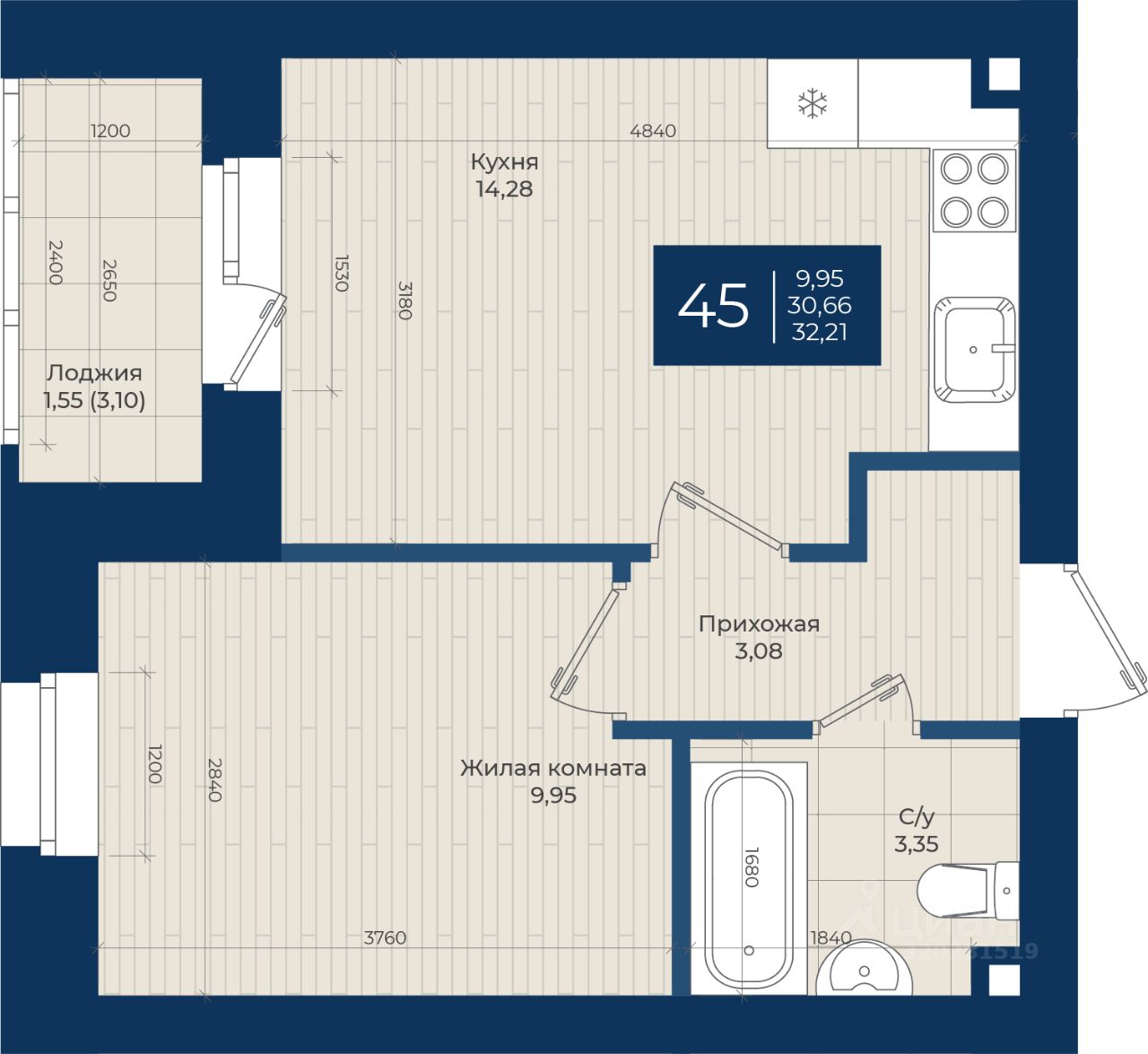 "ЖК на Чехова", Дом 1, Квартира 45 общей площадью 32,21 м2 на 1 этаже.