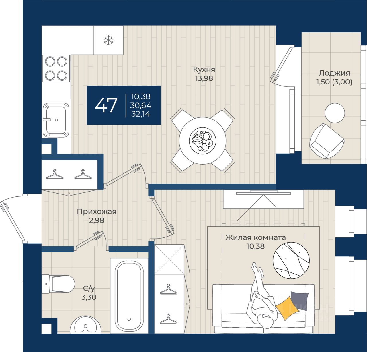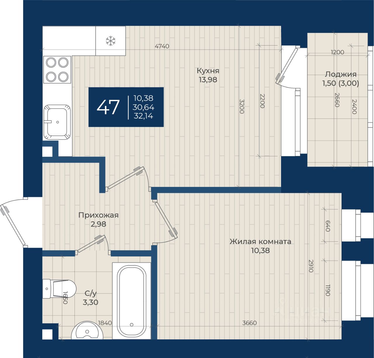 "ЖК на Чехова", Дом 1, Квартира 47 общей площадью 32,14 м2 на 1 этаже.