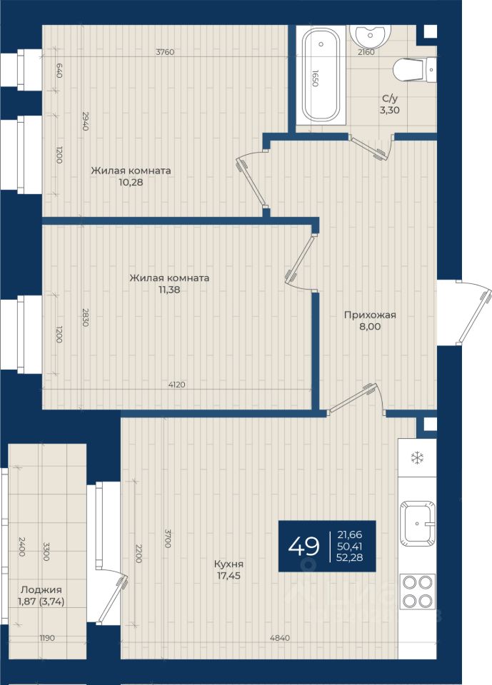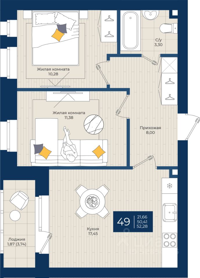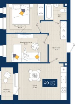 "ЖК на Чехова", Дом 1, Квартира 49 общей площадью 52,28 м2 на 1 этаже.