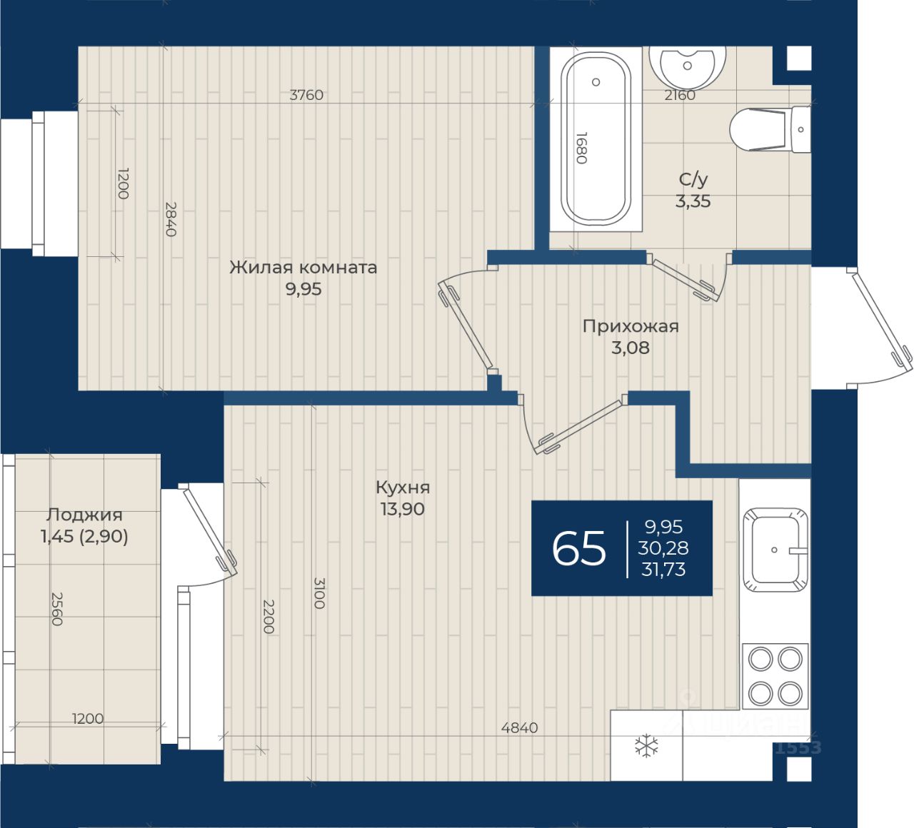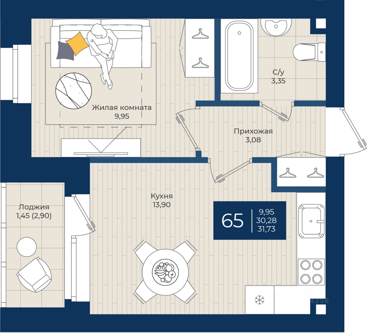 "ЖК на Чехова", Дом 1, Квартира 65 общей площадью 31,73 м2 на 4 этаже.