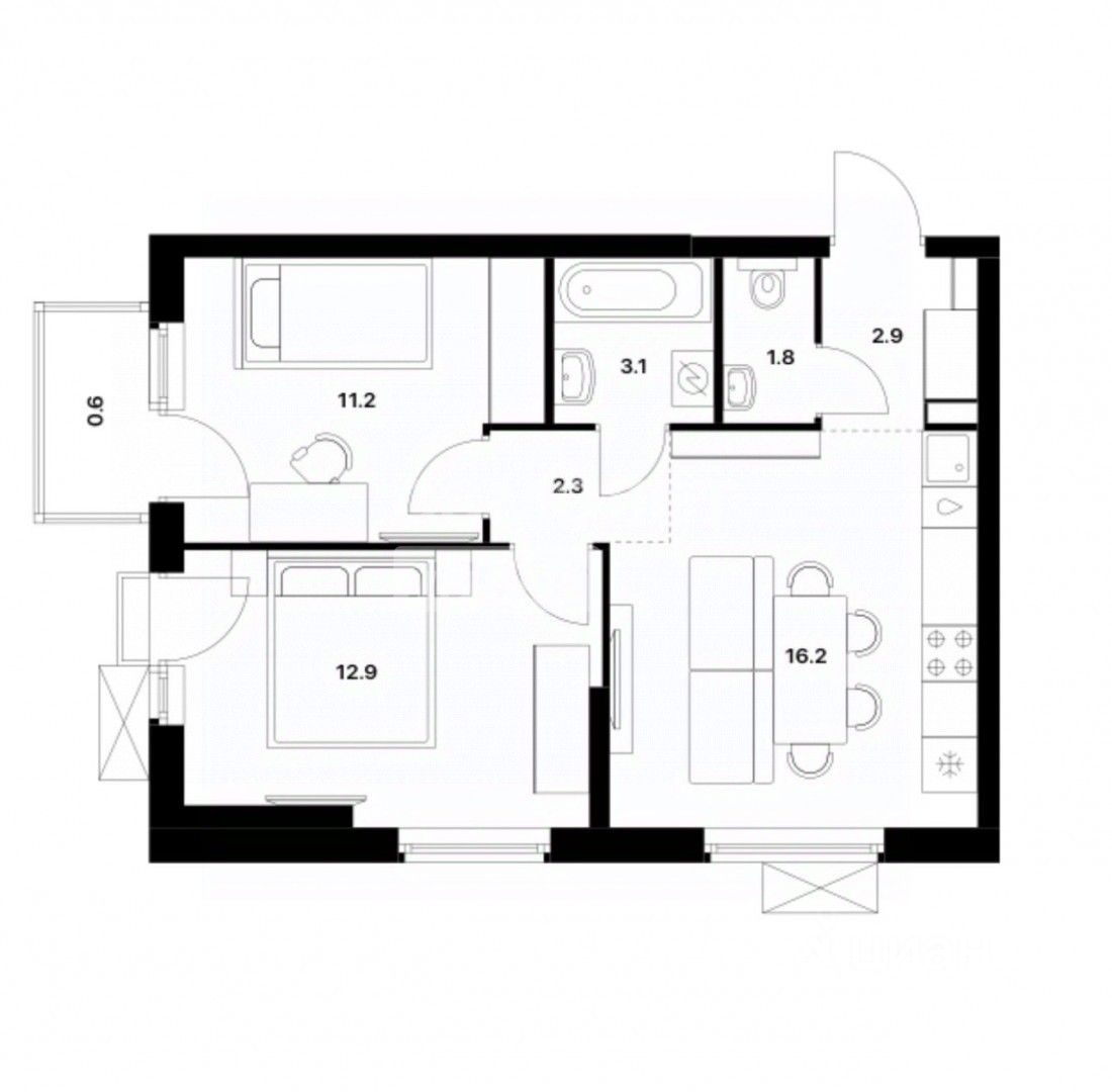 Планировка квартиры удобная: кухнягостиная 16,5 кв.м и две полноценные спальни 12,9 кв.м и 11,2 кв.м. Одна из спален с выходом на балкон с панорамным остеклением и видом на частный сектор.