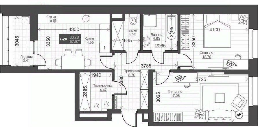 * 2 спальня — 17,08 м² (предусмотрено разделение на две зоны)