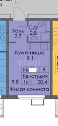 Просторная зона отдыха 9,8 м² и уютная кухня-ниша 5,1 м² все, что нужно для жизни.