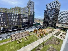 Выход в закрытый двор на стилобате осуществляется через холл третьего этажа. В холле первого этажа для жителей предусмотрена зона отдыха, санузел, лапомойка (комната для мытья лап домашних животных), консьерж сервис, колясочная с местами для хранения велосипедов.
