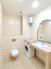 Квартира с ремонтом: на полу ламинат, лучевая разводка отопления, сан. узел в кафеле, оборудована просторная гардеробная, установлен бойлер, заменена входная дверь от застройщика, на более качественную, панорамное остекление балкона, пол - керамогранит. Установлена встроенная мебель на заказ.