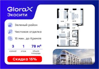 Продается 3-комн. квартира на 1-м этаже в строящемся проекте GloraX Экосити. Общая площадь лота составляет 78,88 кв. м, из которых 40,71 кв. м отведено под жилую и 22,94 кв. м под кухонную зону. Номер квартиры - 283