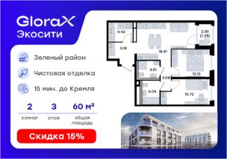 Продается 2-комн. квартира на 3-м этаже в строящемся проекте GloraX Экосити. Общая площадь лота составляет 60,77 кв. м, из которых 20,85 кв. м отведено под жилую и 18,41 кв. м под кухонную зону. Номер квартиры - 325