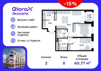 Продается 2-комн. квартира на 5-м этаже в строящемся проекте GloraX Экосити. Общая площадь лота составляет 60,77 кв. м, из которых 20,85 кв. м отведено под жилую и 18,41 кв. м под кухонную зону. Номер квартиры - 335