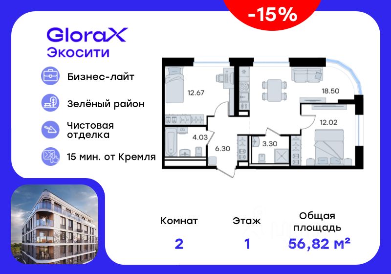 Продается 2-комн. квартира на 1-м этаже в строящемся проекте GloraX Экосити. Общая площадь лота составляет 56,82 кв. м, из которых 24,69 кв. м отведено под жилую и 18,50 кв. м под кухонную зону. Номер квартиры - 355