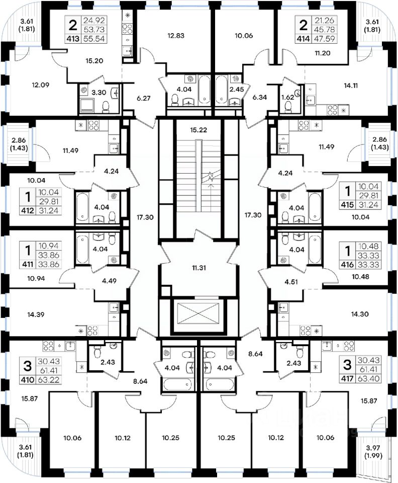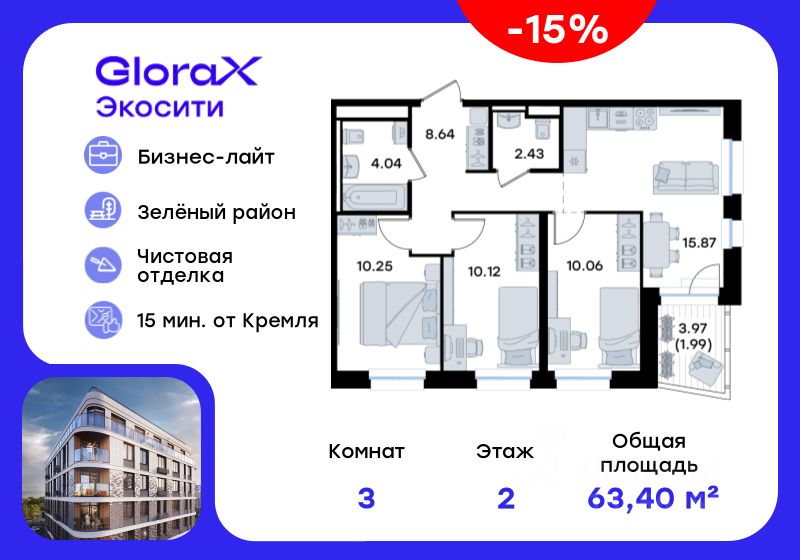 Продается 3-комн. квартира на 2-м этаже в строящемся проекте GloraX Экосити. Общая площадь лота составляет 63,40 кв. м, из которых 30,43 кв. м отведено под жилую и 15,87 кв. м под кухонную зону. Номер квартиры - 417