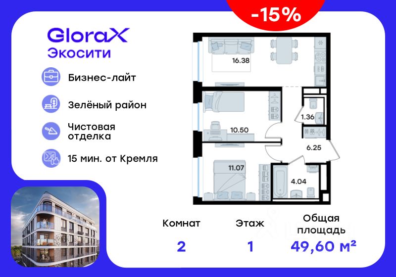 Продается 2-комн. квартира на 1-м этаже в строящемся проекте GloraX Экосити. Общая площадь лота составляет 49,60 кв. м, из которых 21,57 кв. м отведено под жилую и 16,38 кв. м под кухонную зону. Номер квартиры - 1