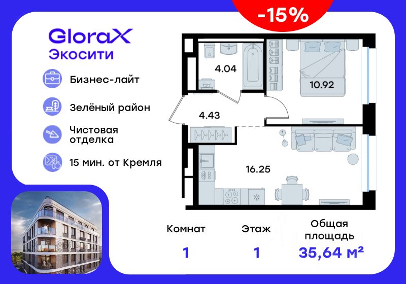 Продается 1-комн. квартира на 1-м этаже в строящемся проекте GloraX Экосити. Общая площадь лота составляет 35,64 кв. м, из которых 10,92 кв. м отведено под жилую и 16,25 кв. м под кухонную зону. Номер квартиры - 3
