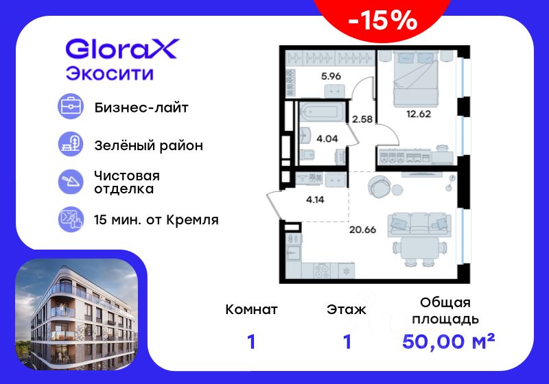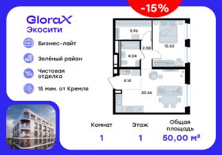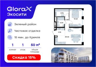 Продается 1-комн. квартира на 1-м этаже в строящемся проекте GloraX Экосити. Общая площадь лота составляет 50,00 кв. м, из которых 12,62 кв. м отведено под жилую и 20,66 кв. м под кухонную зону. Номер квартиры - 4