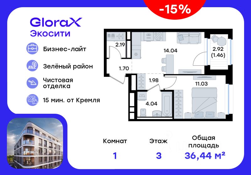 Продается 1-комн. квартира на 3-м этаже в строящемся проекте GloraX Экосити. Общая площадь лота составляет 36,44 кв. м, из которых 11,03 кв. м отведено под жилую и 14,04 кв. м под кухонную зону. Номер квартиры - 19