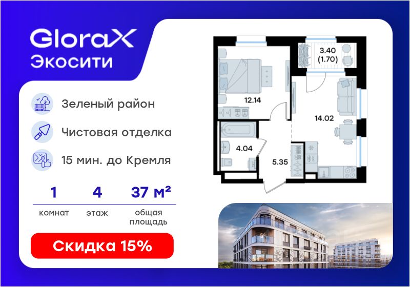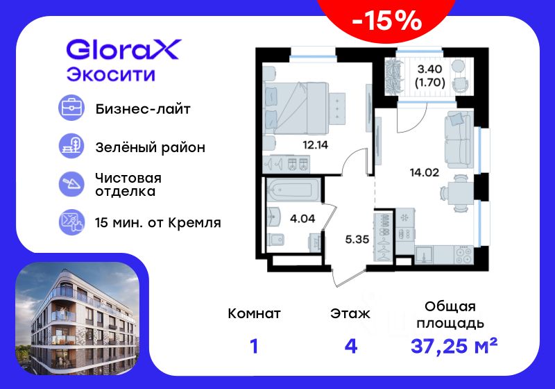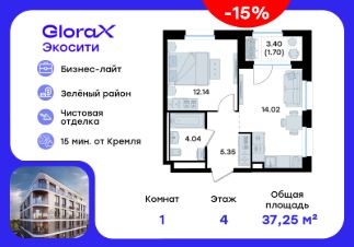 Продается 1-комн. квартира на 4-м этаже в строящемся проекте GloraX Экосити. Общая площадь лота составляет 37,25 кв. м, из которых 12,14 кв. м отведено под жилую и 14,02 кв. м под кухонную зону. Номер квартиры - 155