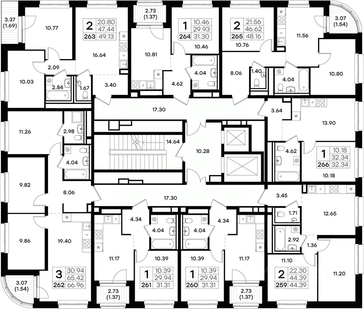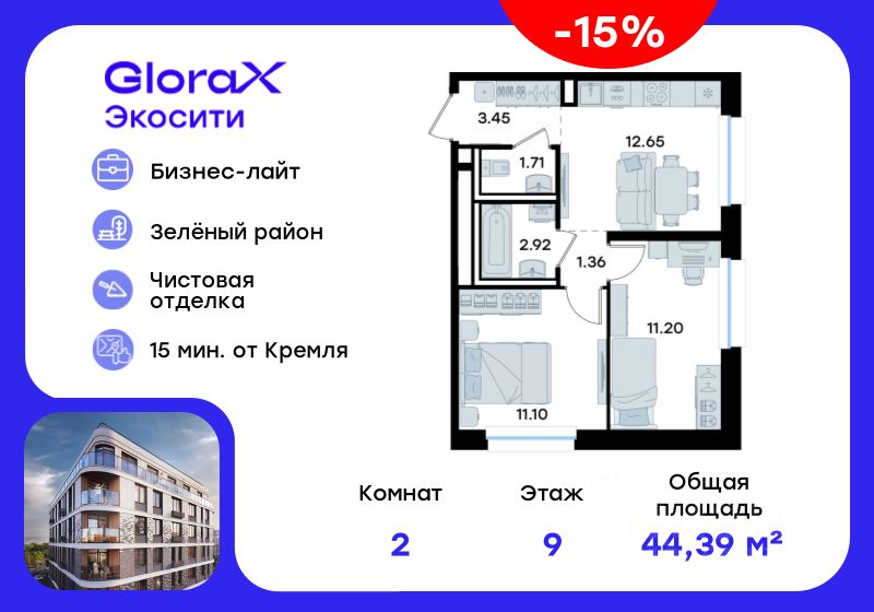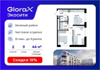 Продается 2-комн. квартира на 9-м этаже в строящемся проекте GloraX Экосити. Общая площадь лота составляет 44,39 кв. м, из которых 22,30 кв. м отведено под жилую и 12,65 кв. м под кухонную зону. Номер квартиры - 259