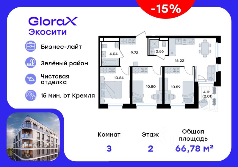 Продается 3-комн. квартира  на 2-м этаже в строящемся проекте GloraX Экосити. Общая площадь лота составляет 66,78 кв. м, из которых 32,23 кв. м отведено под жилую и 16,22 кв. м под кухонную зону. Номер квартиры - 4