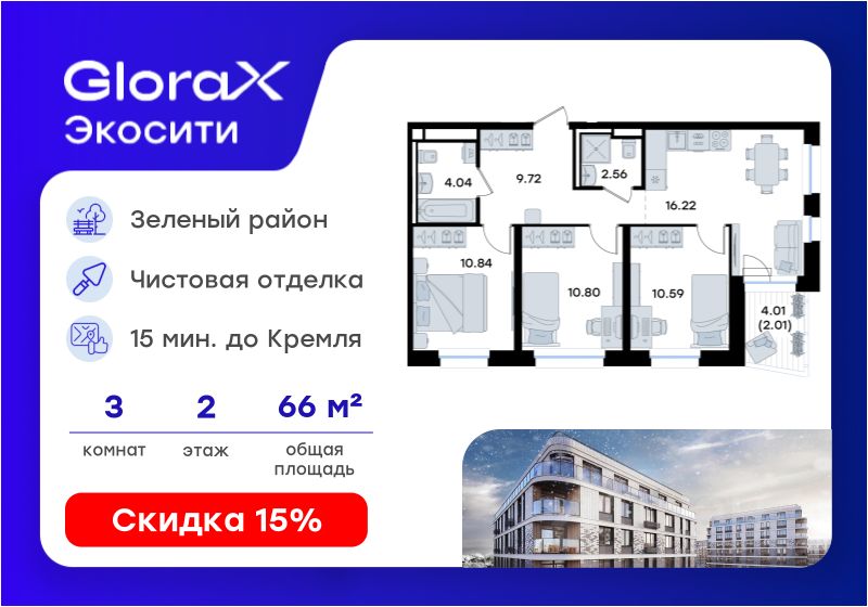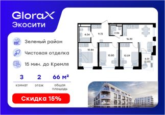 Продается 3-комн. квартира на 2-м этаже в строящемся проекте GloraX Экосити. Общая площадь лота составляет 66,78 кв. м, из которых 32,23 кв. м отведено под жилую и 16,22 кв. м под кухонную зону. Номер квартиры - 4
