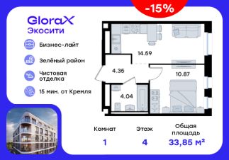 Продается 1-комн. квартира на 4-м этаже в строящемся проекте GloraX Экосити. Общая площадь лота составляет 33,85 кв. м, из которых 10,87 кв. м отведено под жилую и 14,59 кв. м под кухонную зону. Номер квартиры - 16